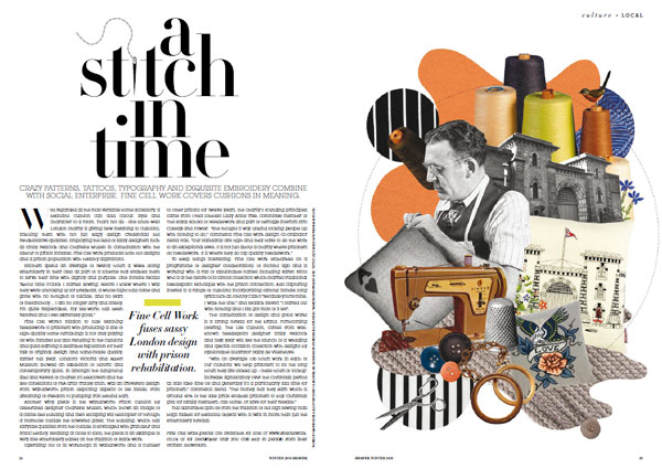Crazy patterns, tattoos, typography and exquisite embroidery combine with social enterprise. Fine Cell Work covers cushions in meaning.