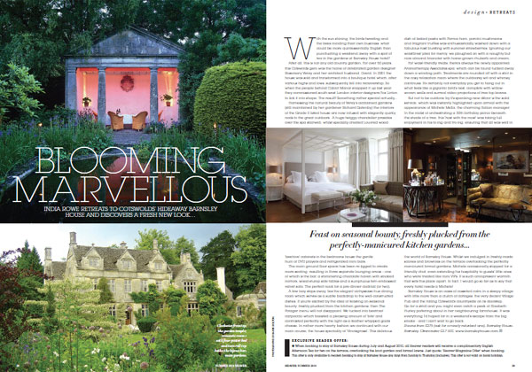 …Harnessing the natural beauty of Verey’s acclaimed gardens, the interiors of the Grade II listed house are now infused with elegantly quirky nods to the great outdoors. A huge twiggy chandelier presides over the spa stairwell, whilst specially created Louvred wood ‘beehive’ cabinets in the bedrooms house the gentle hum of DVD players and refrigerated mini bars…